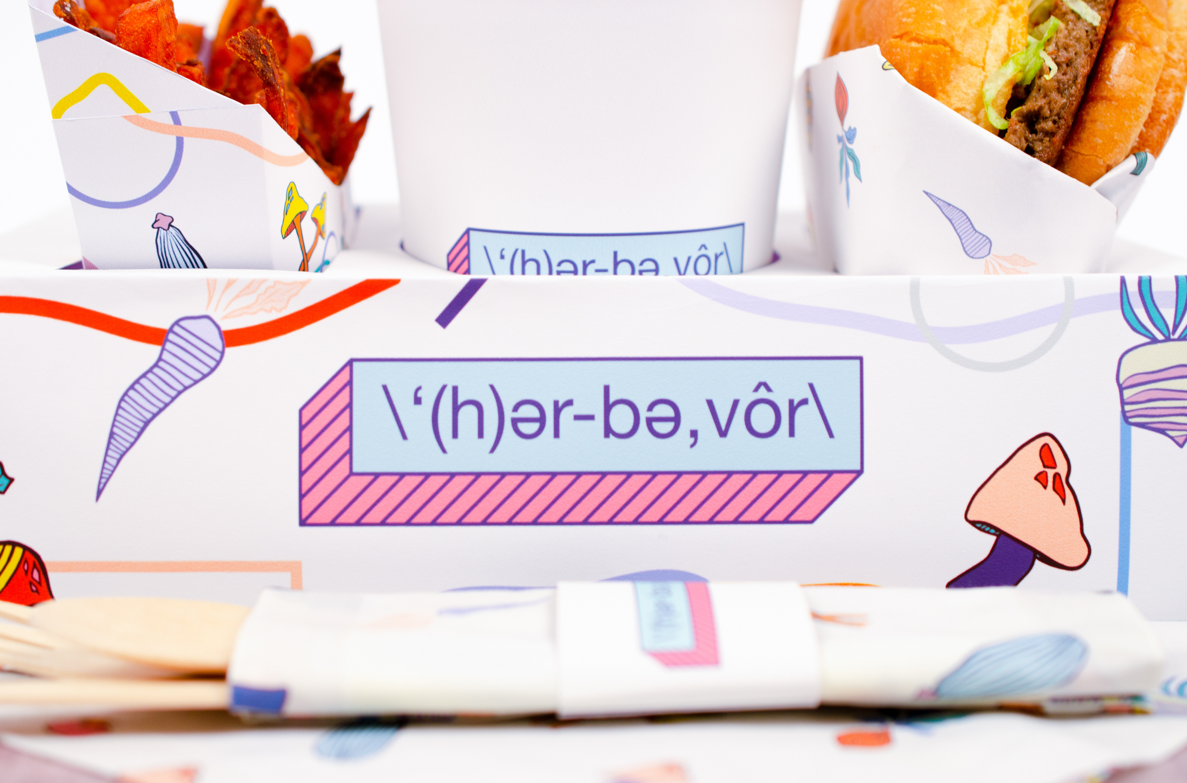 \‘(h)әr-bә,vôr\ is a plant based fast food restaurant that I created for my Packaging and Display class. The deliverables that were required: a take-out cup design, some sort of main sandwich / burger wrapper, a napkin, plastic utensils and an outer carrying case of some sort. I chose the name \‘(h)әr-bә,vôr\ since it is the phonetic spelling of herbivore, thought it was quite playful and that it would go with the branding that I wanted to create. I illustrated colorful icons of various vegetables for the main pattern used throughout, I also included some scattered shapes and squiggles to add some haptic whimsy to a couple packaging components.